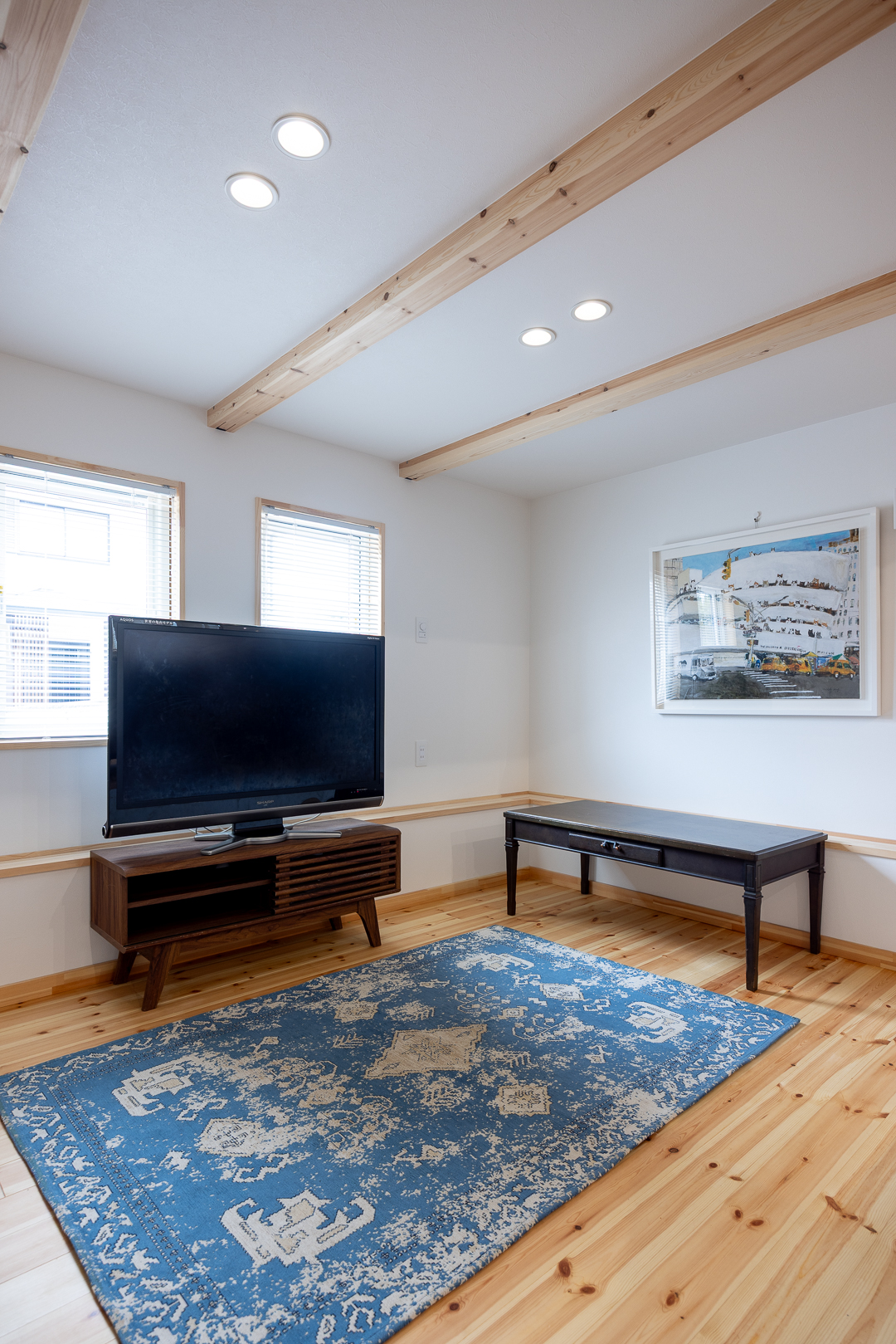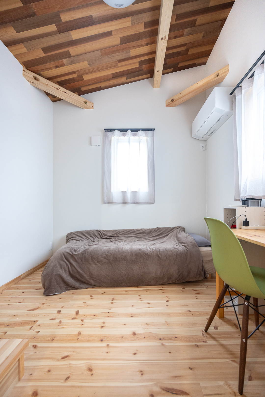 勾配天井の開放感あふれる洋室。高い天井と木目の質感が、空間にあたたかみとゆとりをもたらす。ゆったりと自分時間を過ごせる一部屋。