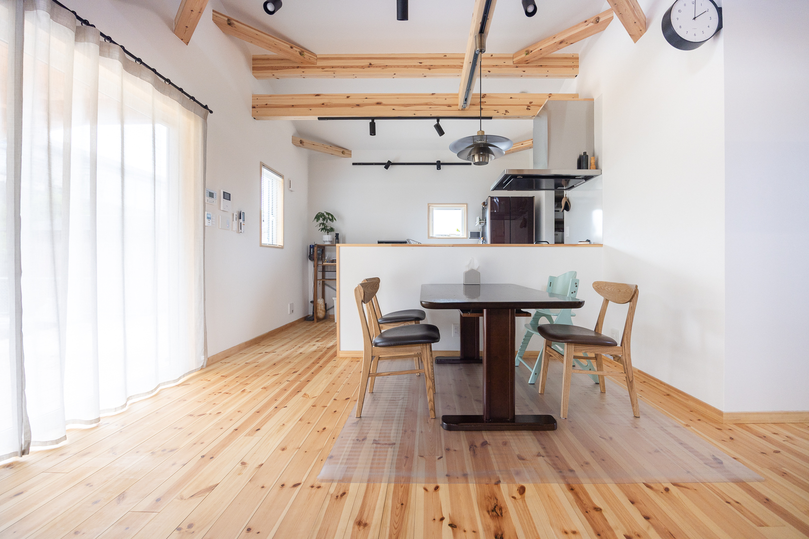 カーテン越しの柔らかな光が広がるダイニング。素足に気持ちいい無垢床と、ほどよい高さの腰壁でキッチンとゆるやかにつながり、家族が自然と集まる場所に。
