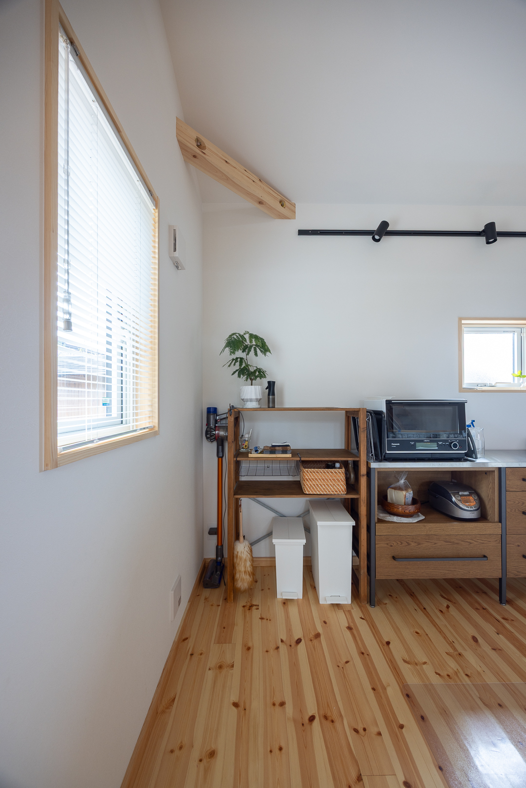 キッチン裏には、生活感を上手に隠せる収納スペースを配置。家電やゴミ箱、掃除道具まで無理なく収まり、すっきりとしたキッチンを保つことができる。